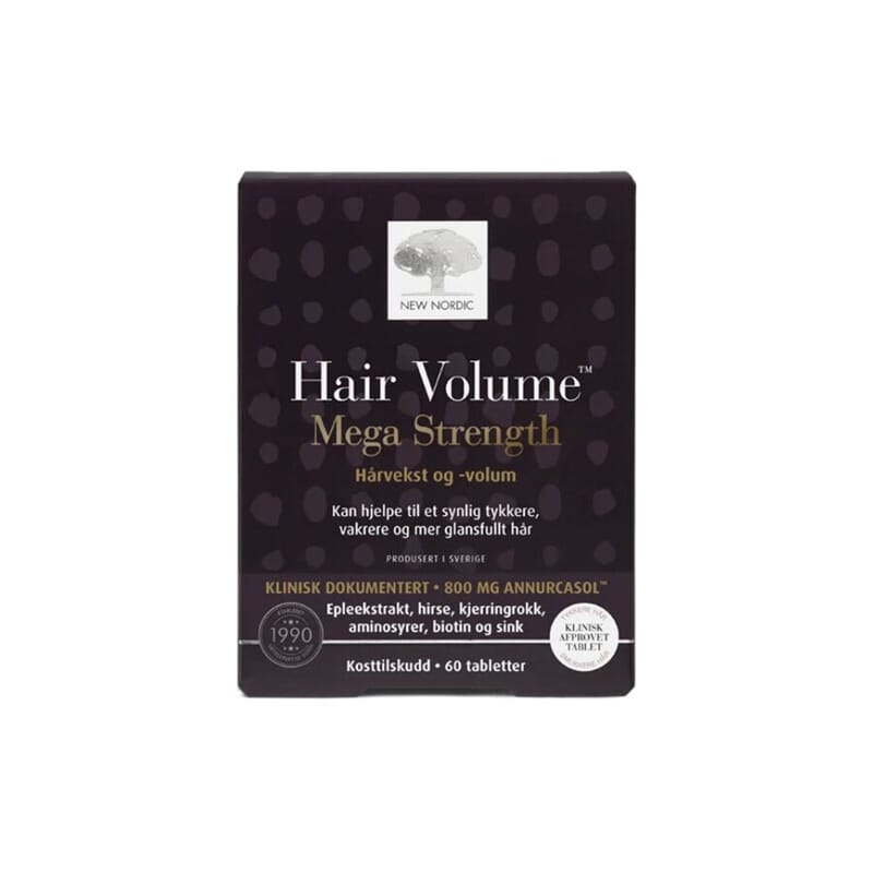 Hair Volume™ Mega Strength er et kosttilskudd for hår, utviklet for å bidra til å vedlikeholde et mer glansfullt og tykkere hår. Tilskuddet har et høyt innhold av Annurca™, et eksklusivt epleekstrakt, samt botaniske ingredienser, aminosyrer og næringsstoffer som alle bidrar til å målrettet støtte hårets normale funksjon.