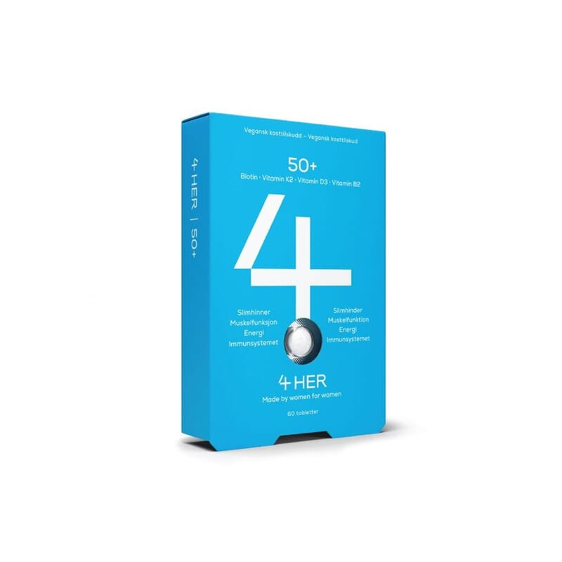 4HER 50+ er et kosttilskudd utviklet for kvinner over 50 år som ønsker støtte til kroppens normale funksjoner i hverdagen. Formelen kombinerer utvalgte vitaminer som er tilpasset denne livsfasen, og er laget med fokus på kvalitet, renhet og enkel daglig bruk.