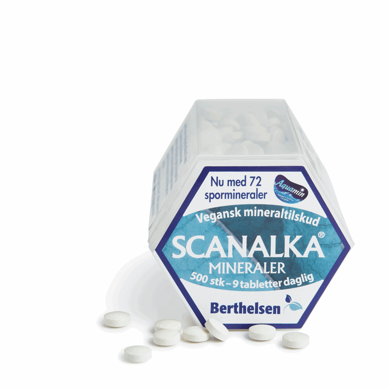 Scanalka er et allsidig vegansk kosttilskudd med 12 mineraler og 72 spormineraler fra rødalgen Lithothamnion callcareum (Aquamin).