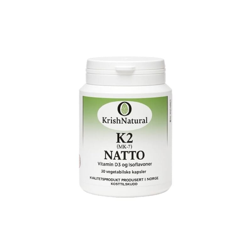 KrishNatural K2 Natto inneholder naturlig vitamin K2 (Mk7) fra fermentert natto, kombinert med vitamin D3, nattlysolje og soyaisoflavoner. Vitamin K2 og D3 bidrar til å opprettholde normal benbygning og normal funksjon av immunsystemet.