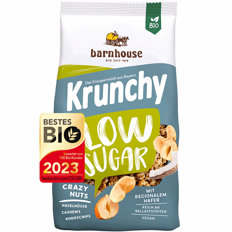 Krunchy Low Sugar Crazy Nuts - Økologisk Knasende Müsli med Lite Sukker, Cashewnøtter, Hasselnøtter og Kokosflak