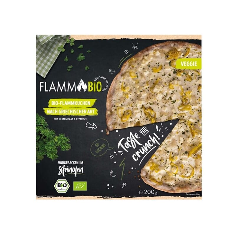 Økologisk pizza inspirert av greske smaker, laget etter tradisjonell fransk oppskrift. Den sprø, steinovnsbakte bunnen er toppet med kremet crème fraîche, smakfull hyrdeost, chilipepper og persille.