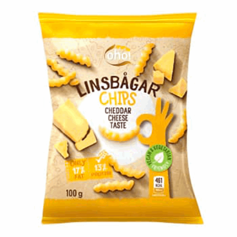OHO! Linsbågar med smak av cheddar er veganske, smakfulle og sprø chips laget av linser.