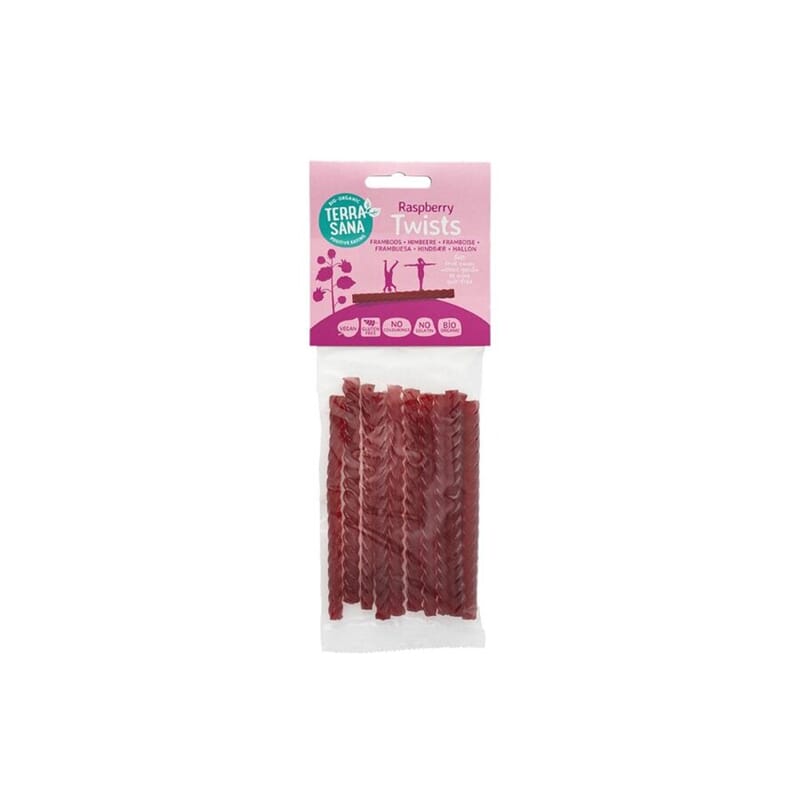 Lyst på noe søtt? Da må du prøve disse deilige, økologiske bringebærtvistene fra TerraSana med myk og litt seig konsistens. Her får du en lett og fruktig sødme helt uten kunstige farger og tilsetninger.