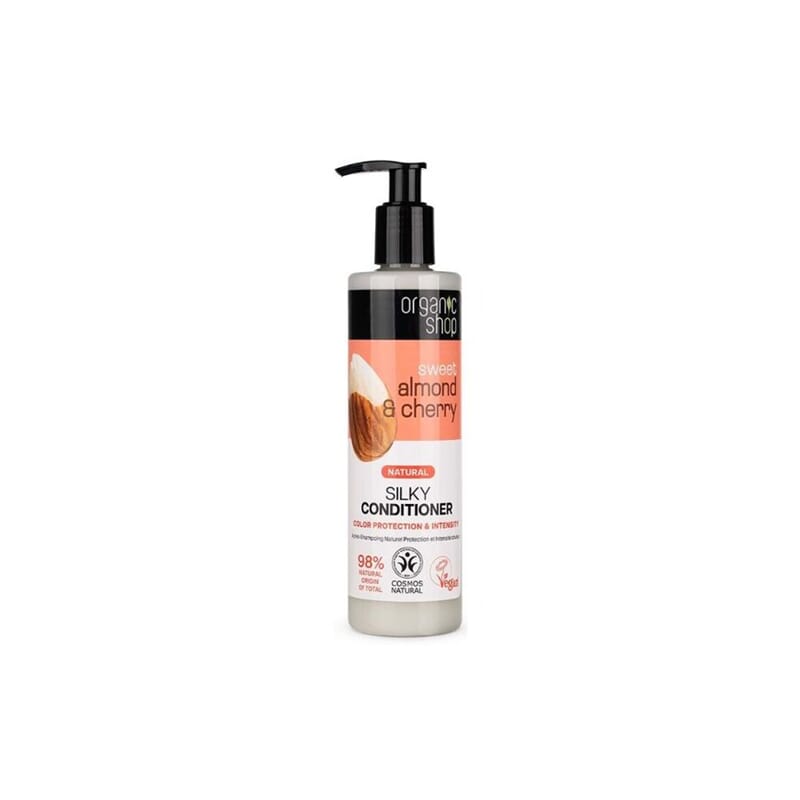 Organic Shop Almond & Cherry Conditioner er en pleiende balsam som bidrar til å mykgjøre håret og gjøre det mer håndterbart. Formulert med mandelolje og kirsebærekstrakt tilfører den fuktighet og etterlater håret mykt og lett å gre. Et godt valg for daglig pleie, med en mild og behagelig duft.
