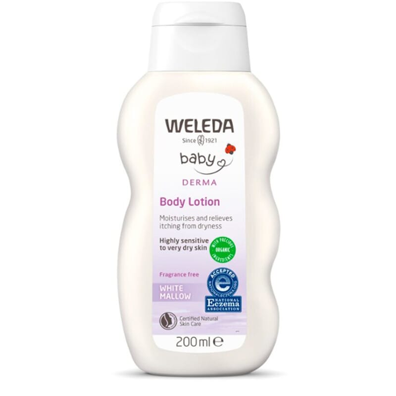 White Mallow Body Lotion er en body lotion basert på naturlige kokos- og sesamoljer og ekstrakt fra hvit kattost som gir en naturlig beskyttelse til babyens hud. Den lindrer, avkjøler og beroliger følsom og meget følsom babyhud.