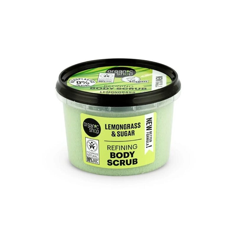 Organic Shop Refining Body Scrub Lemongrass er en kroppsskrubb med sukker og frisk duft av sitrongress. Massér på fuktig hud og skyll av med vann.