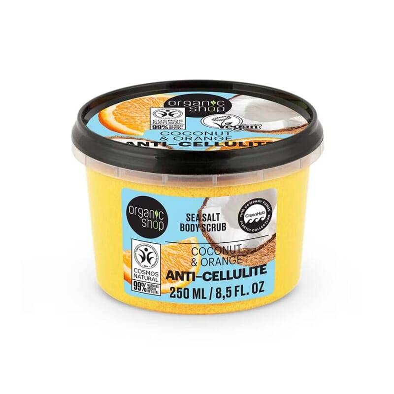 En effektiv kroppsskrubb som fjerner døde hudceller og etterlater huden myk og glatt. Havsalt gir en grundig eksfoliering, mens økologisk kokosolje og appelsinolje tilfører fukt og næring. Regelmessig bruk kan bidra til en fastere hud og redusert synlighet av cellulitter.